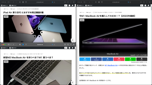 クラムシェルモードは、MacBook Airなどのディスプレイを閉じた状態で外付けのディスプレイを繋いで表示させますので、キーボードやトラックパッド(マウス)が必要になりますが、M1 MacBook Airなら13.3インチしかないディスプレイを外付けディスプレイに繋ぐことでマルチタスク表示が更にみやすくなり、またユニバーサルコントロールで表示出来るiPadもありますので、作業効率が格段向上します。