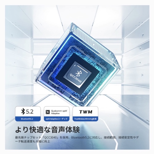最新チップセット「QCC3040」の消費電力制御により、イヤホンは1回のフル充電で約5時間、充電ケースとの組み合わせで約17.5時間の使用が可能です。