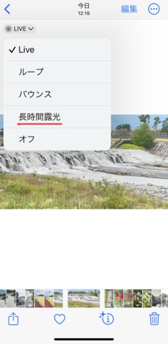 赤丸箇所の『LIVE』をタップして『長時間露光』を選択すると出来上がり!