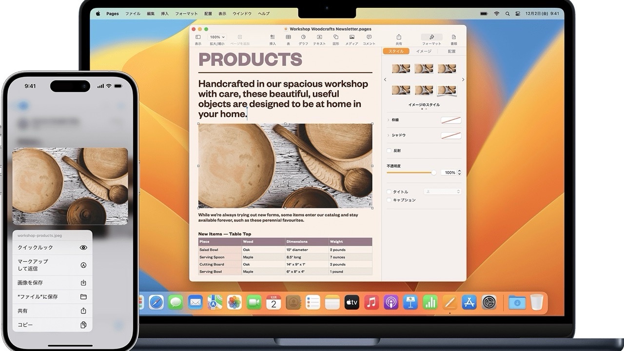 iPhone、iPad、iPod touch を使って書類をスキャンしたり、近くにあるものを撮影すると、すぐに Mac に表示されます。