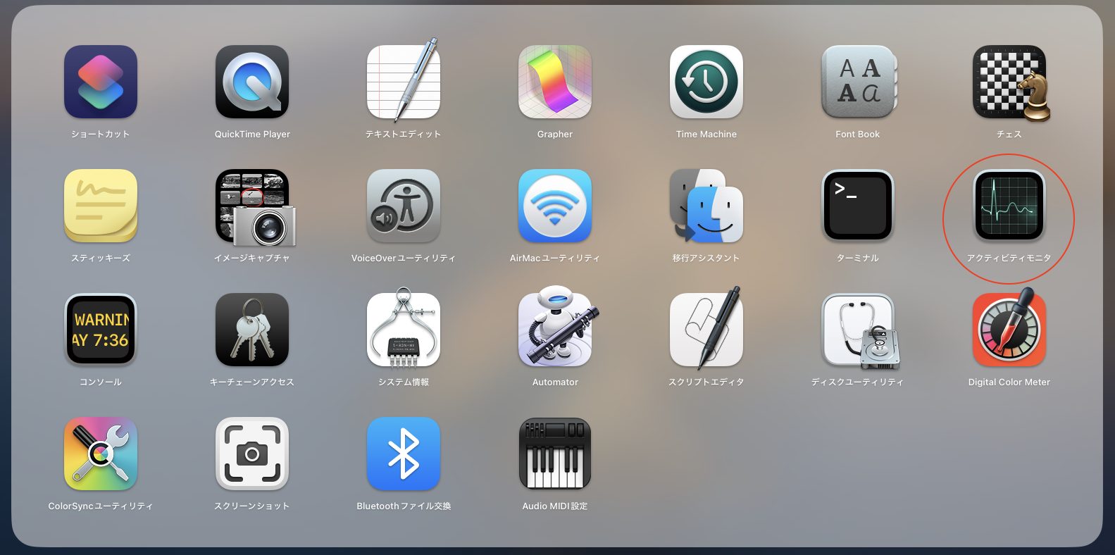 Launchpad ⇨ その他 ⇨ アクティビティモニタで確認することができます。