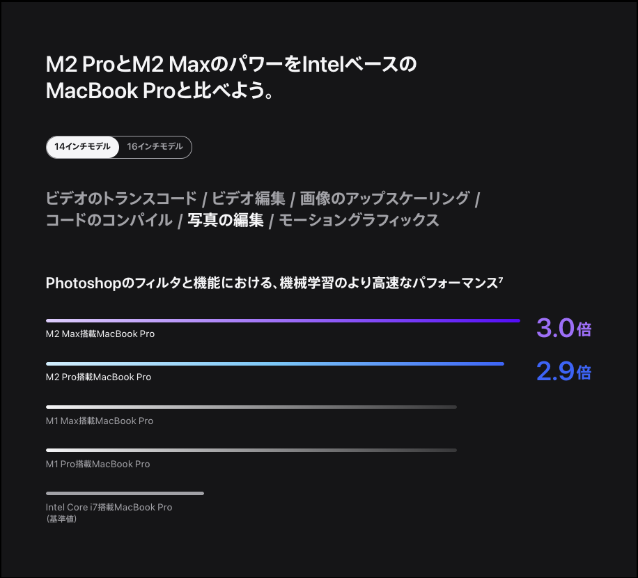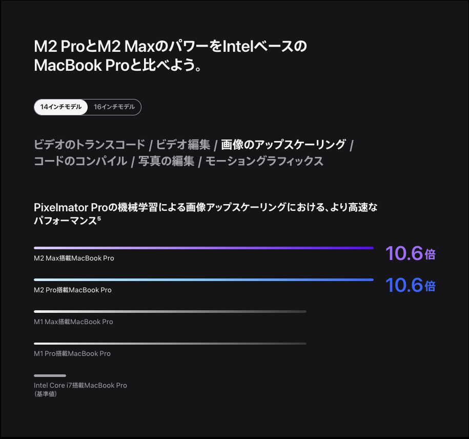 これはM2 Pro/Max MacBook Proの公式ページでの比較になりますが、「画像のアップスケーリング」や「写真の編集」などは「M2 Pro搭載 MacBook Pro」の方が「M1 Max搭載 MacBook Pro」よりもパフォーマンスは優れています。