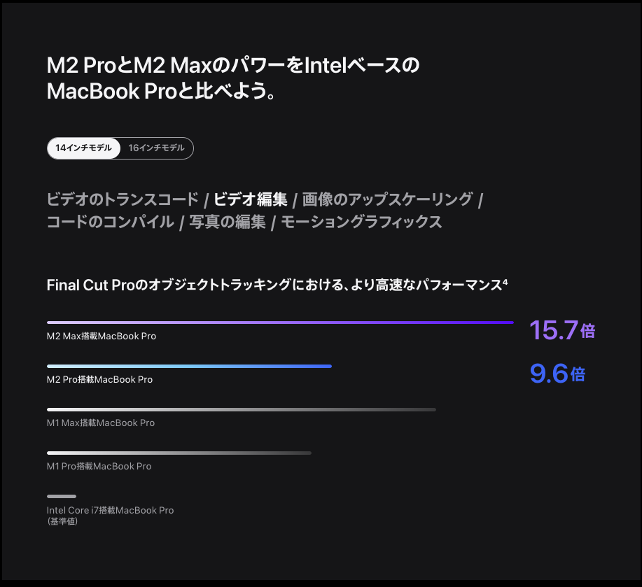 これもM2 Pro/Max MacBook Proの公式ページでの比較になりますが、『Final Cut Proのオブジェクトトラッキングにおける、より高速なパフォーマンス』などでは、M1 Maxの方がハイパフォーマンスです。