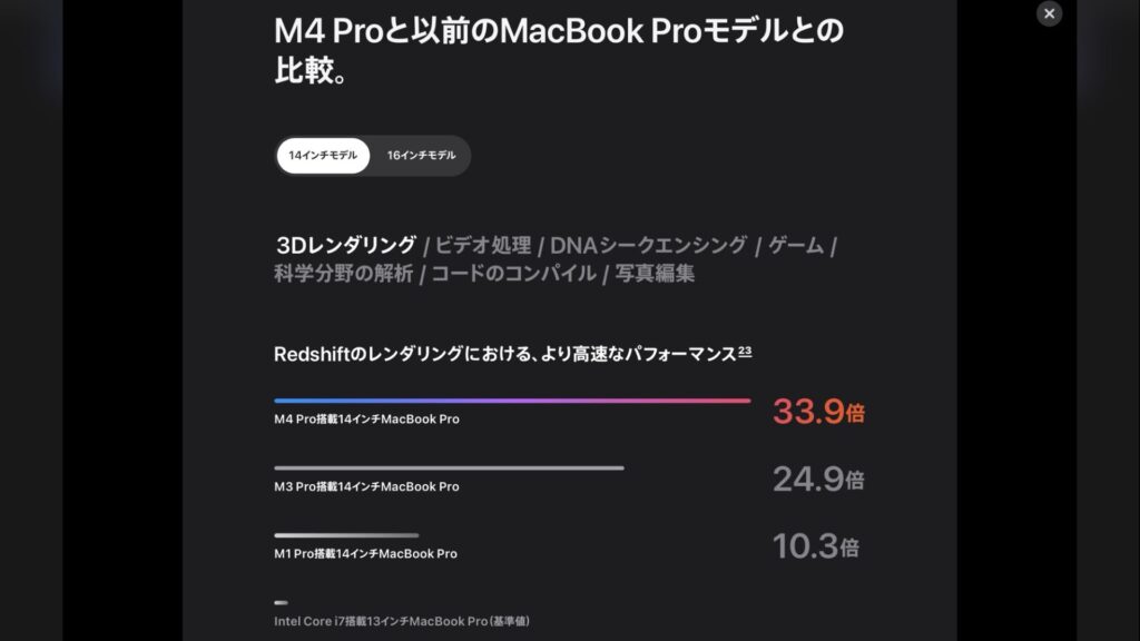 M4 Proと以前のMacBook Proモデルとの比較。3Dレンダリングの場合 引用 : Apple