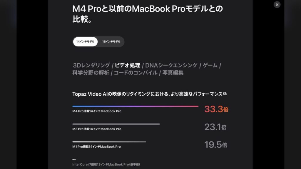 M4 Proと以前のMacBook Proモデルとの比較。ビデオ処理の場合 引用 : Apple