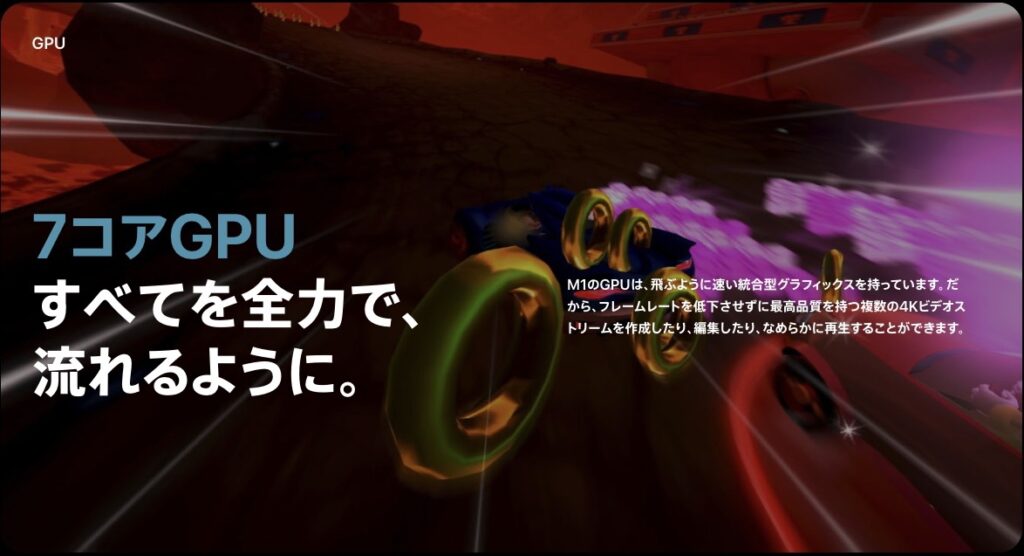 ・CPU:Apple M1チップ(8コアCPU、8コアGPU、16コアニューラルエンジン)