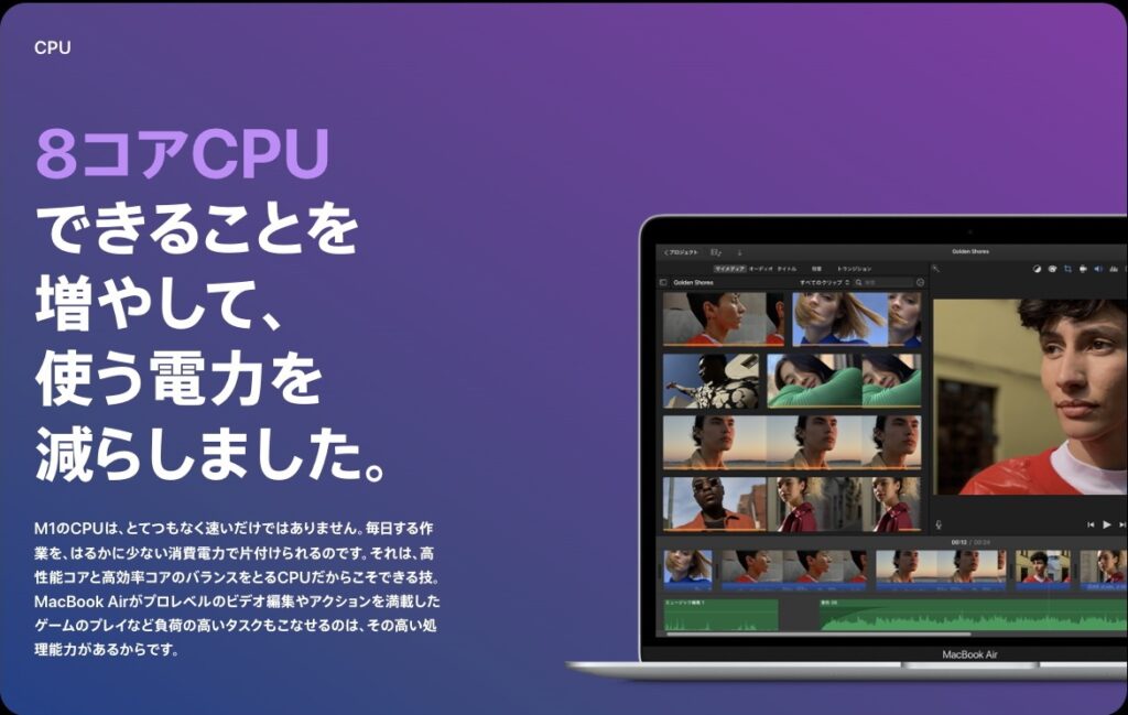 M1チップによって、M1 MacBook Airは、従来のMacBook Airと比較して、高速な動作や長時間のバッテリー駆動を実現しています。