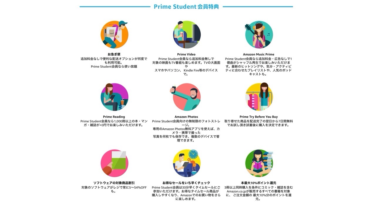 Prime Studentに登録すると、次のような特典を受けることができます。