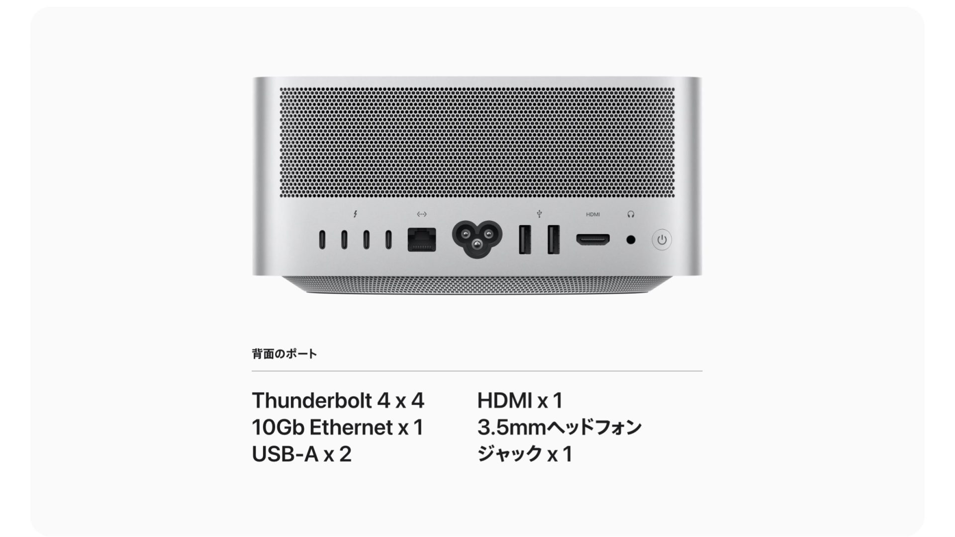 M2 Pro Mac miniは、省スペースで冷却効果の高いデザインを採用しています。そのため、狭いスペースなどさまざまな環境に設置することができます。また、静音性も高いため、静かな作業環境を保つことができます。 - 外部デバイスとの接続性