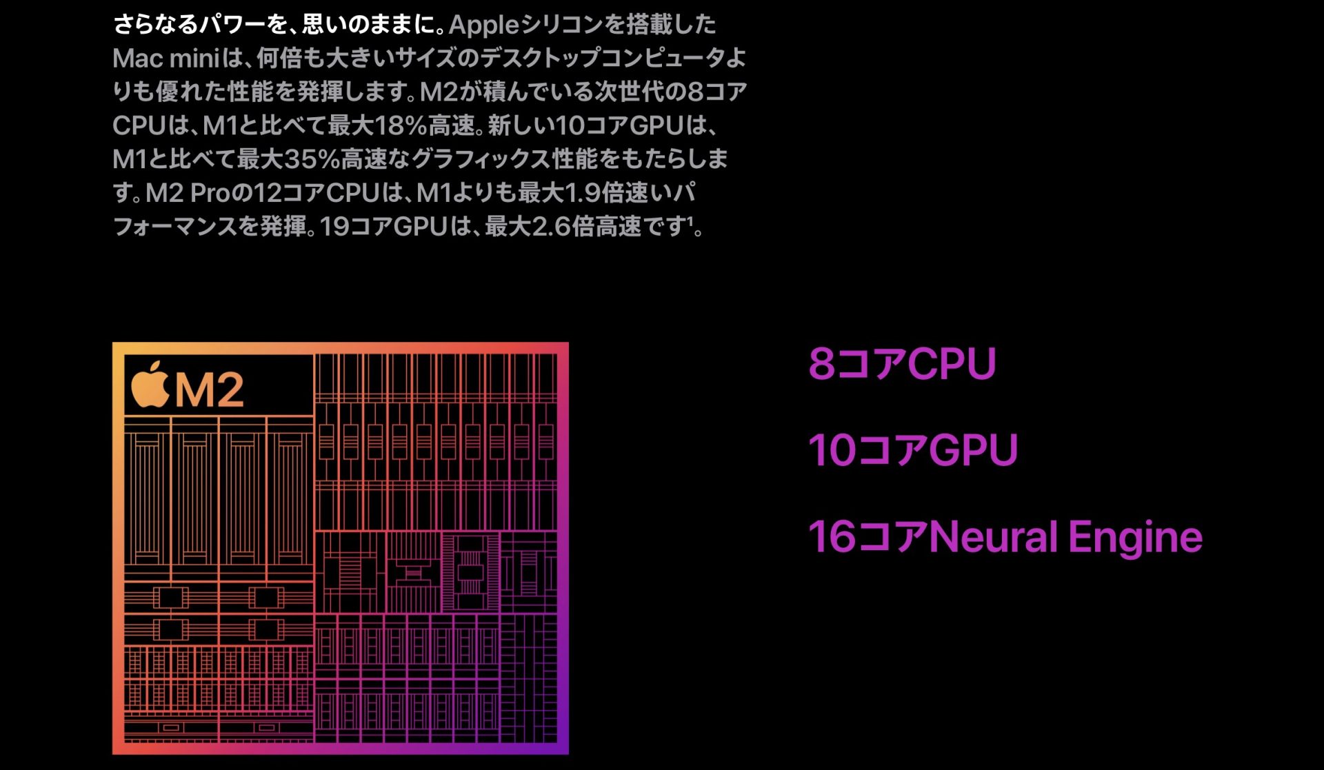 M2 Mac miniは、Apple自社設計のM2チップを搭載しています。