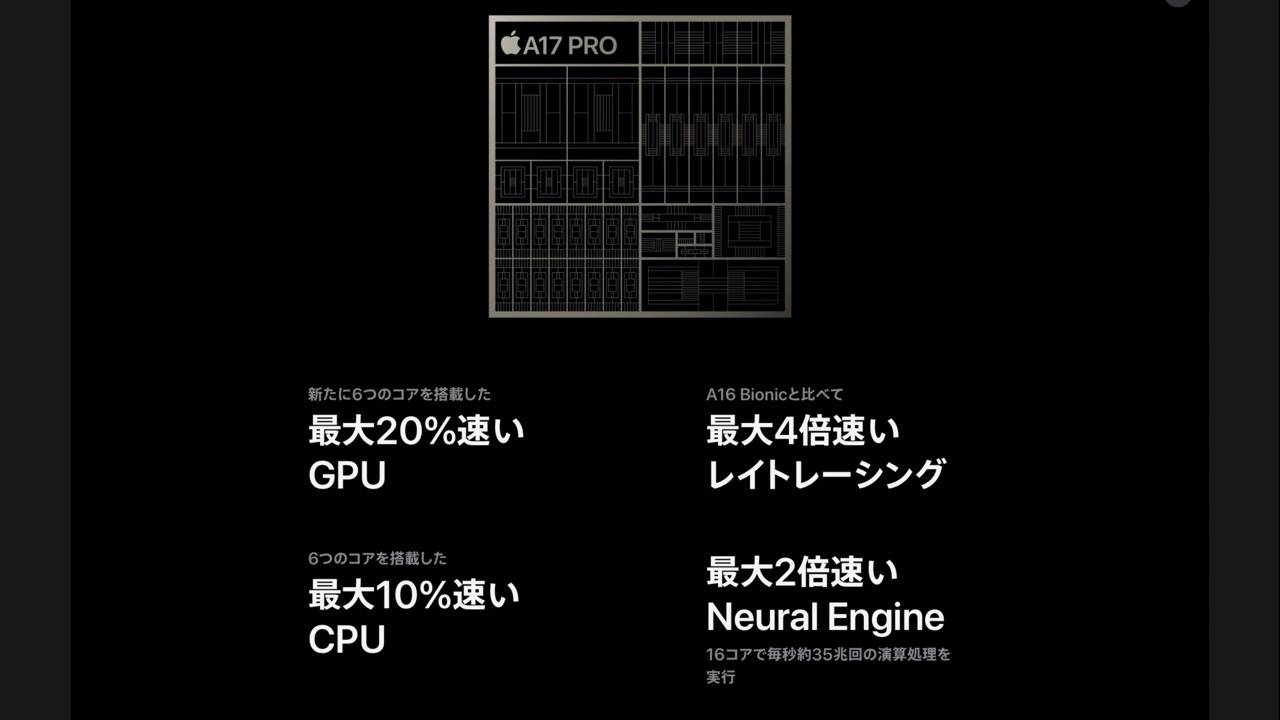 iPhone 15 Proには新しい「A17 Proチップ」が新しく搭載され、iPhone 14 Pro搭載の「A16 Bionic」よりもGPUコア数が一つ多い6コアGPUとなりました。