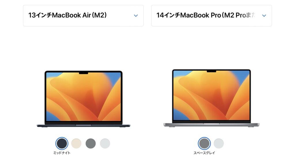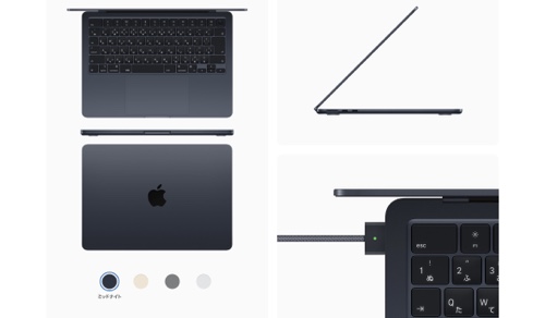 MacBook Airは、さまざまなカラーバリエーションが用意されています。従来のシルバーやスペースグレイに加え、M2 MacBook Airではスターライトやミッドナイトなどのシックなカラーオプションも選ぶことができます。