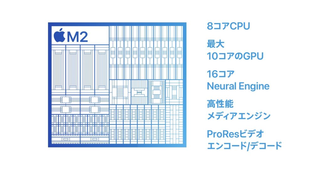M2チップは、高速なクロック速度、複数コアのCPUとGPU、高度なキャッシュメモリなどを特長としており、複雑なタスクや多重のアプリケーションの同時実行にも対応しています。