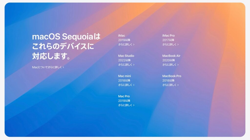 2024年発表のmacOS Sequoiaが2020年以降のMacBook Air対象ということは、4年前のMacまではサポート対象になっているということになります。