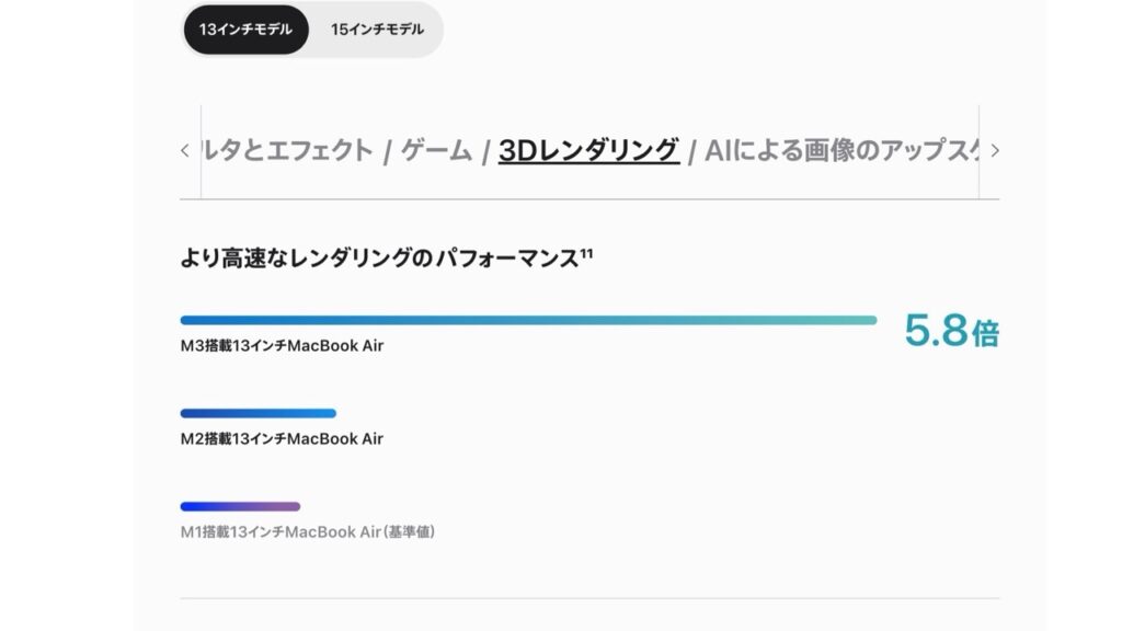 一方、今MacBook Air(M2)を利用しているユーザーで「3Dレンダリング」などクリエイティブな利用をそれ程しない方は、買い替えても大きな違いを感じることは無いかもしれません。