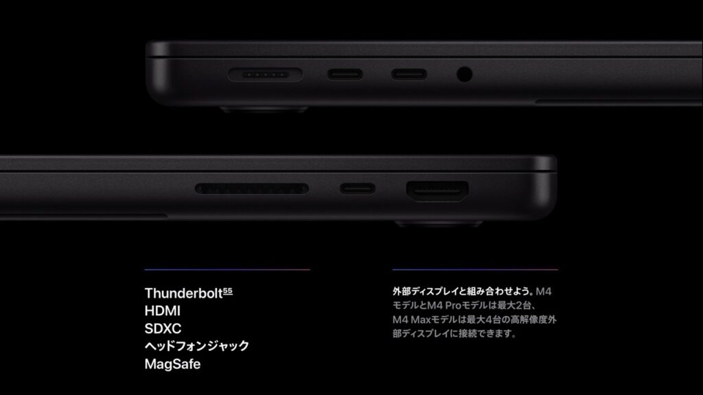 MacBook Airは、Thunderbolt 4対応のUSB-Cポートが2つ搭載されています。MacBook Proは、Thunderbolt 4対応のUSB-Cポートが3つ、上位モデルであるM4 Pro/M4 Maxの14インチ、16インチにはThunderbolt 5(USB-C)ポートが3つ搭載されており、より多くの外部デバイスを接続できます。