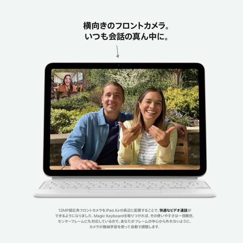 このモデルから、フロントカメラが横向き時に画面上部中央へ配置され、ビデオ会議などで利用しやすくなりました。12MPの超広角フロントカメラを搭載し、M1 iPad Air同様にセンターフレーム機能をサポートします。センターフレームは、ユーザーがカメラの前で動いても自動的にフレーム内に収める機能で、ビデオ通話や録画中により自然な体験を提供します。また、より高解像度のセルフィーやビデオが撮影可能です。 - リアカメラの性能向上