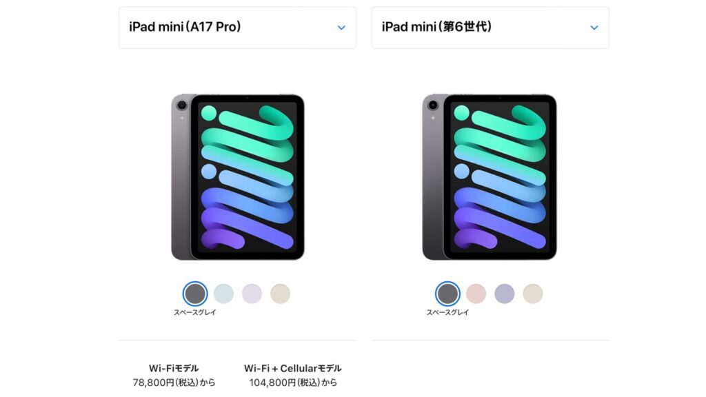 iPad mini 第6世代の64GB/Wi-Fiモデルが84,800円だったのに対し、iPad mini(A17 Pro)はストレージ容量128GBと倍のストレージになったにも関わらず78,800円と6,000円の値下げになったことです。