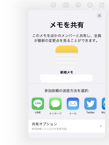 右上の右から二番目のアイコンをクリックし、「メモを共有」を選択します。