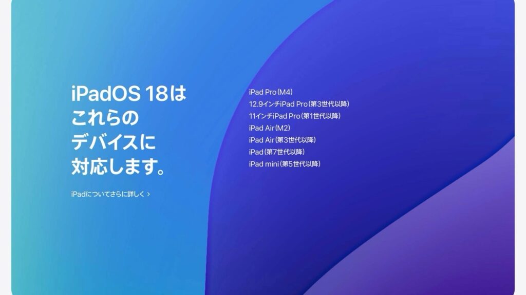 現在最新のiPadOS18に対応しているiPadは次のとおりです。