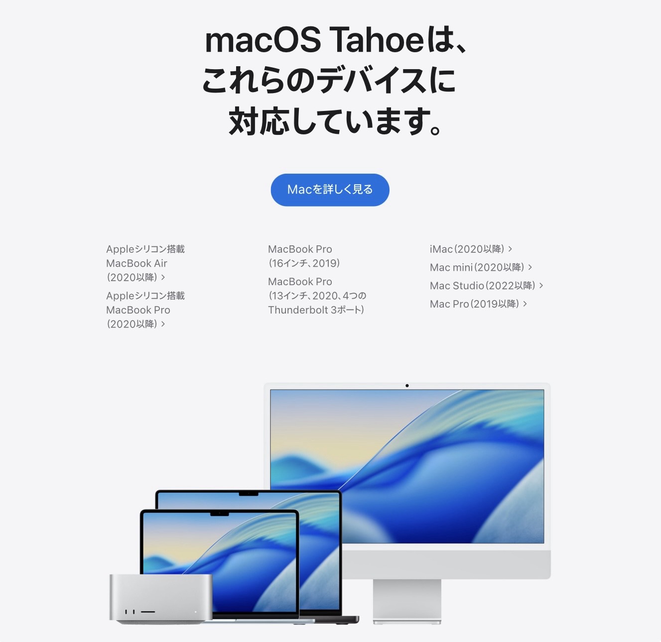 2025年10月時点で最新のmacOSである「macOS Tahoe」のサポート端末はこのようになっています。